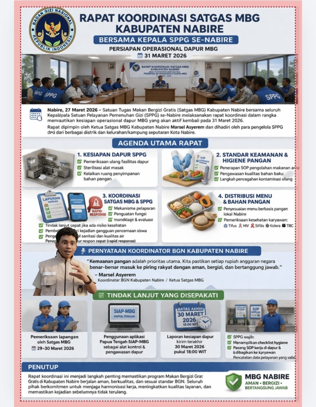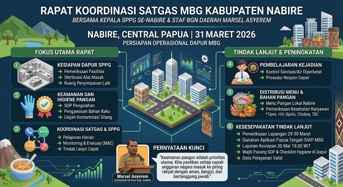Hal tersebut disampaikannya usai memimpin rapat koordinasi bersama Satuan Tugas MBG Kabupaten Nabire yang melibatkan seluruh kepala Satuan Pelayanan Pemenuhan Gizi (SPPG). Rapat ini difokuskan pada pemantapan kesiapan teknis dan non-teknis guna memastikan program berjalan optimal sejak hari pertama pelaksanaan.